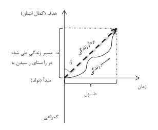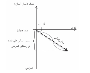مطابق شکل 2-5 الف اگر بردار به بردار مسير زندگي انسان کامل و بردار را بردار زندگي شخص تشبيه کنيم، طول تصوير بردار زندگي در امتداد بردار کمال که همان امتداد مثبت محور قائم است، مؤيد زندگي طي شده در راستاي رسيدن به کمال هست، همان مقدار کمال کسبشده توسط شخص در طول عمر خود است. هر چه زاويه بردار زندگي با بردار کمال يا امتداد قائم کمتر باشد ميزان کمال بهدستآمده بيشتر و درنتيجه انسان به خدا نزديکتر ميشود. اگر زاويه بردار زندگي با محور قائم زاويه بين 90 تا 180 در جه داشته باشد يعني اعمال بد انسان بر اعمال نيک غلبه کند در اين صورت مطابق شکل 2-5 ب بردار زندگي در امتداد منفي محور قائم که همان جهت گمراهي است قرار ميگيرد.