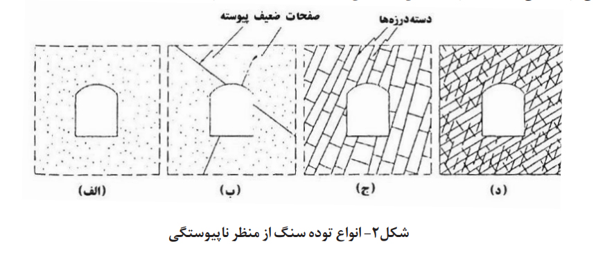 در مكانيك جامدات محيط ايدهآل محيطي پيوسته، همگن و همسانگرد است. ولي شواهد نشان ميدهد كه در محيطهاي سنگي اين شرايط وجود ندارد و ناپيوستگيها مهمترين عامل در بينظمي و عدم امكان دسترسي به شرايط ايدهآل است. پارامترهايي مثل چگالي درزهداري، شيب و جهت شيب،گسترش و فاصلهداري (پلهاي سنگي) ازنظر هندسي و ويژگيهايي مثل شرايط سطح درزه (بازشدگي، زبري، هوازدگي و دگرساني) و آب درزه نيز از ويژگيهاي مكانيكي آنهاست. همانگونه که در شکل 2 مشاهده ميشود توده سنگ به 4 دسته ماده سنگ(الف)، ماده سنگ با چند درزه(ب)، درزهدار(ج) و خرد شده(د) تقسيم ميگردد و هر چه چگالي درزهداري، گسترش، بازشدگي، هوازدگي ناپيوستگيها بيشتر باشد توده سنگ ناپايدارتر خواهد بود. لذا مهمترين معيار طبقهبندي توده سنگ ناپيوستگيها هستند. مهمترين سيستمهاي پايدارسازي توده سنگ سيستمهايي هستند که مقاومت اين ناپيوستگيها را بالا ميبرد و ميتوان به تزريق بتن و رزين و مهاريها اشاره کرد.